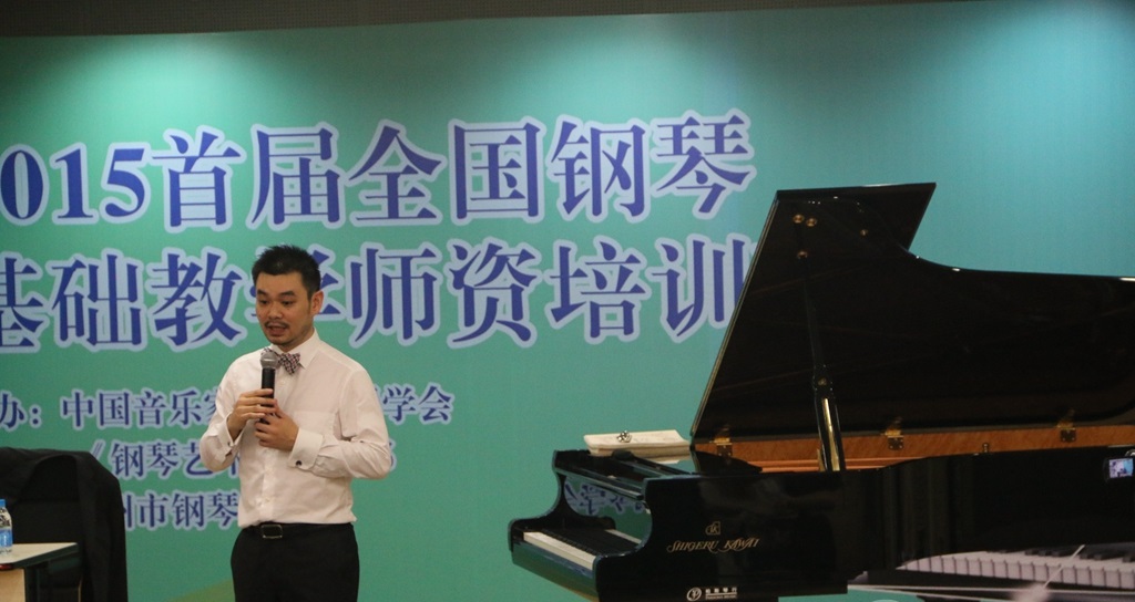6月30日,2015年全国钢琴基础教学师资培训班苏州站的第一天,美籍华裔钢琴家、星海音乐学院附中钢琴学科副系主任孙鹏杰教授受邀讲解了《欧美少儿钢琴教学法》。孙教授阐述了让学生独立,尽快不需要老师的欧美教学理念,并详细描述了课程安排。他分析了目前国内普遍使用的一些钢琴启蒙教材的问题,介绍了自己的教材选择和技术训练方法。讲座中,孙教授语言轻松幽默、深入浅出,并亲自进行了大量示范演奏,令在场的学员受益良多。